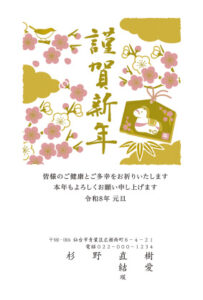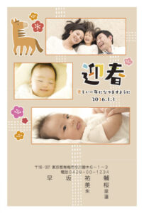 挨拶文を置く場所が難しいレイアウトですが、左に挨拶文、下に差出人を置くと、スッキリとまとまった印象の年賀状になりますよ。