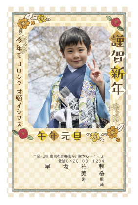 和風の年賀状にしたい、という場合でも控えめフレームのパターンにしたり、単色のフレームにしたりするなどしてバランスをとると、人物や和装が引き立ちます。